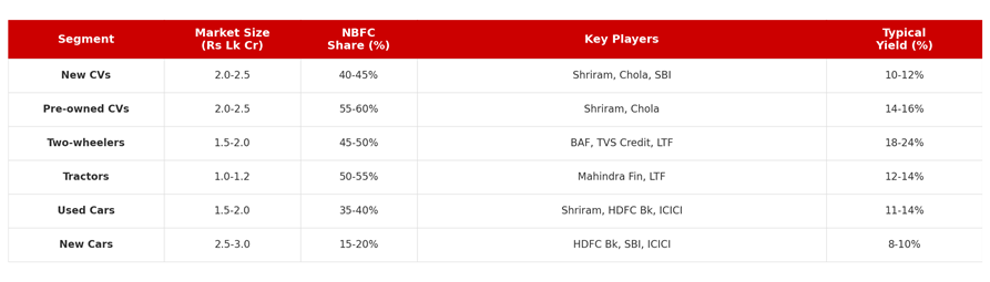 India’s vehicle finance market is one of the largest NBFC segments, with total outstanding credit estimated at Rs 10-12 lakh crore across all vehicle types. NBFCs dominate the non-new-car segments, holding an estimated 55-60% market share in used commercial vehicles, 45-50% in two-wheelers, and 35-40% in used cars. New car financing remains bank-dominated, with HDFC Bank, SBI, and ICICI Bank holding the lion’s share.