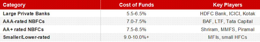 The advantage banks hold is simple and powerful: cost of funds. A large private bank can raise deposits at 6-6.5%, while an AAA-rated NBFC pays 7-8% for its borrowings. That 100-150 basis point differential is enormous in a business where net interest margins are the primary driver of profitability.