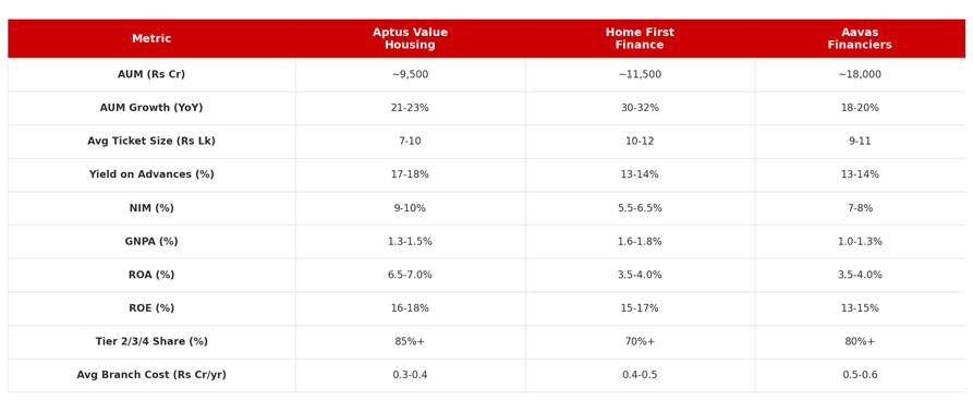 Affordable Housing Finance: Comparative Metrics (FY25/Latest)