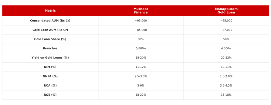 Muthoot Finance is the undisputed leader with a consolidated gold loan AUM exceeding Rs 85,000 crore. The company operates through 5,800+ branches, primarily in South India, though it has been expanding aggressively in the North and West. The franchise is old, tracing its roots back to 1887 in Kerala. NIMs run at 11-12%, and the ROA has consistently been in the 5-6% range.