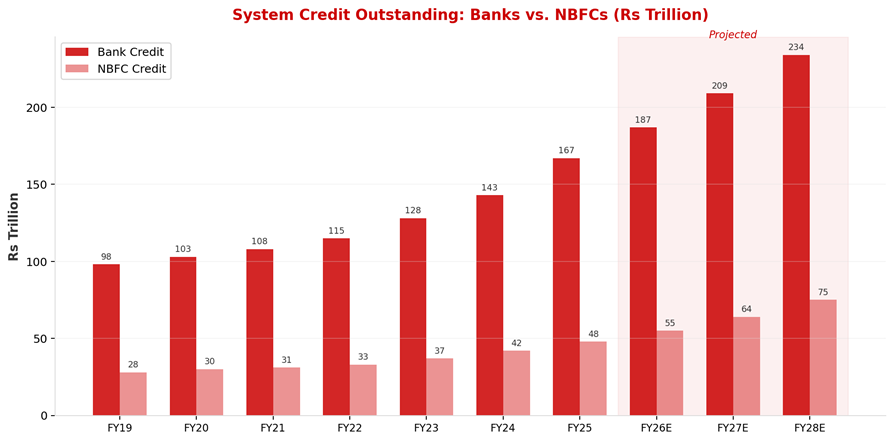 System Credit Outstanding: Banks vs. NBFCs, FY19-FY28E (Rs Trillion)