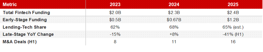 Early-stage funding surged 78% year-on-year to $1.2 billion in 2025, up from $667 million in 2024. Even as late-stage cheques got harder to come by (late-stage fintech funding dropped 41% in H1 2025 versus H1 2024), seed and Series A investors were doubling down on the next generation of lending startups. The lending-tech vertical alone absorbed $1.7 billion, or 68% of total fintech funding, in 2024.