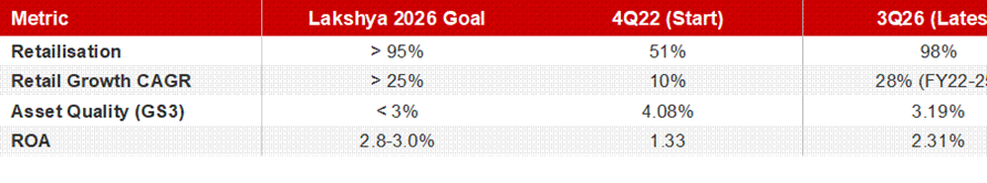 The board and management team is genuinely intriguing: Jairam Sridharan (former Axis Bank) as MD & CEO, Shikha Sharma (former Axis Bank CEO) on the board, Anjali Bansal (Avaana Capital founder), and Nitin Nohria (former Dean of Harvard Business School). Management has guided for 3% ROA at the terminal state. Reaching that from the current ~1.5-1.8% requires a meaningful shift in both mix (more retail, less wholesale) and cost efficiency (opex/assets needs to come down by 50-70 bps). I’m watching the quarterly trajectory on this one closely.