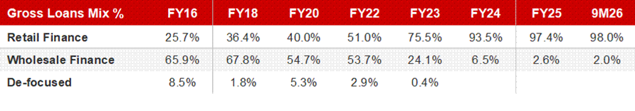 The L&T Finance transformation is the most instructive case study of how an Indian NBFC can reinvent itself. In 2016, LTF’s loan book was 66% wholesale, primarily infrastructure and real estate. By December 2025, retail loans constituted 98% of the book. The company went through IL&FS, Covid, and the 2024-25 MFI stress. AUM between FY20-23 actually declined as it deliberately ran down wholesale.